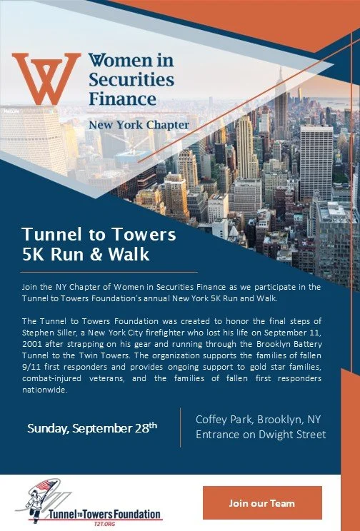 Join the NY Chapter of Women in Securities Finance as we participate in the Tunnel to Towers Foundation’s annual New York 5K Run and Walk. You can participate in person by running or walking, or support us virtually by donating. We welcome family, friends, and colleagues to join our team!