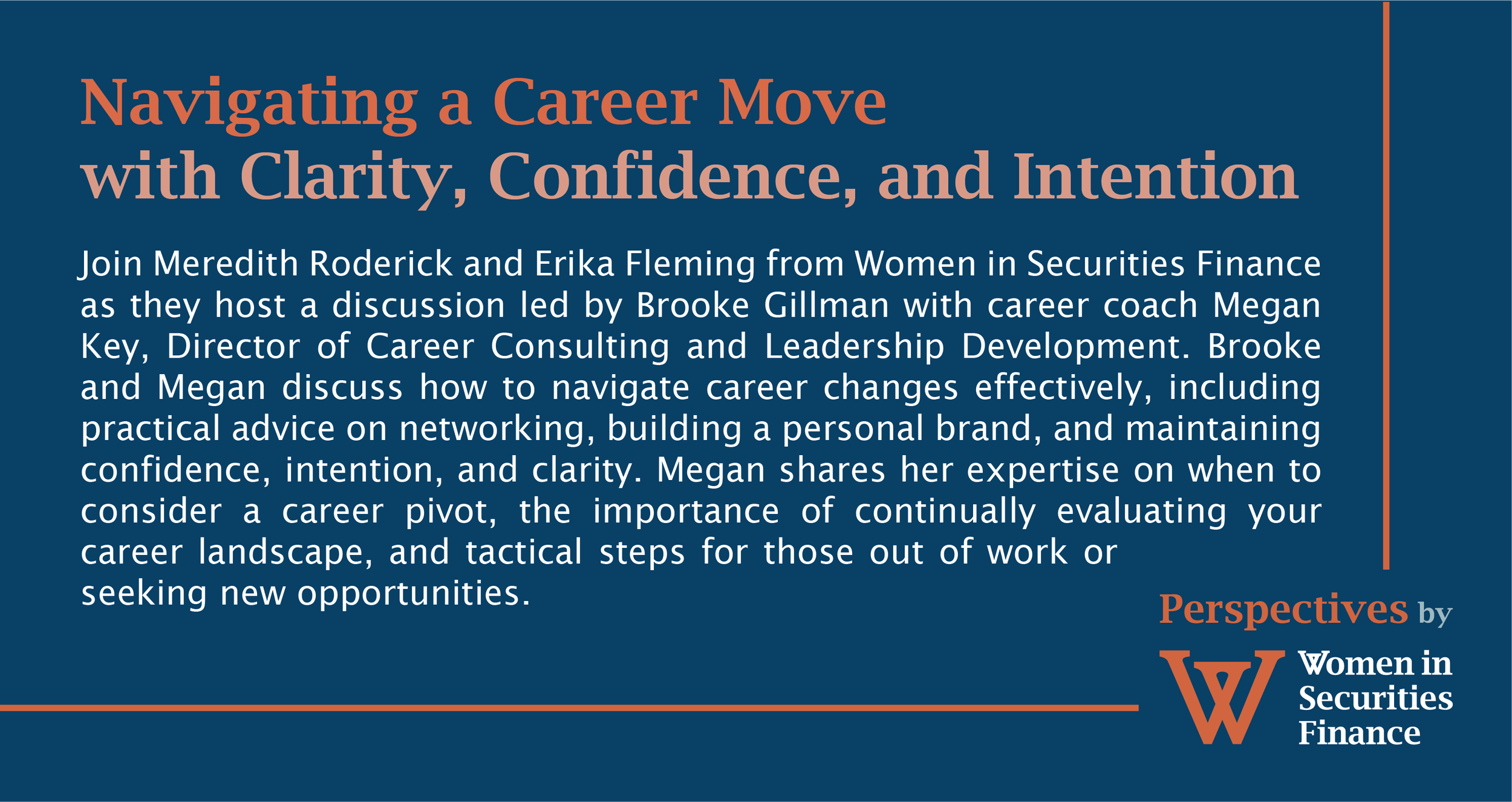 Join Meredith Roderick and Erika Fleming from Women in Securities Finance as they host a discussion led by Brooke Gillman with career coach Megan Key, Director of Career Consulting and Leadership Development. Brooke and Megan discuss how to navigate career changes effectively, including practical advice on networking, building a personal brand, and maintaining confidence, intention, and clarity. Megan shares her expertise on when to consider a career pivot, the importance of continually evaluating your career landscape, and tactical steps for those out of work or seeking new opportunities.